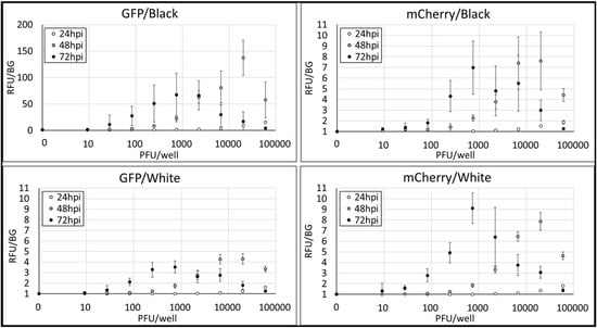 The examination of conditions of rRSV-fluorescent protein infection experiments. X-axis shows rRSV PFU per well. Y-axis shows relative fluorescence unit normalized as 0 PFU sample = 1.0 RFU. Each RFU was calculated as average of three experiments of triplicates per one experiment. Error bars show standard deviations of each samples normalized as 0 PFU sample = 1.0 RFU. The examined parameters were two rRSV reporter types (GFP or Cherry), three incubation times (24, 48, or 72 h post-infection), and two plate types (black or white 96-well plates), resulting in 12 experimental conditions assessed.