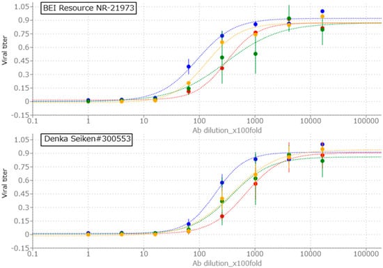 Figure 4 shows the results. All tested assay conditions demonstrated antibody dependent RSV neutralization, reflected by a reduction in the viral titer signal (RFU for GFP and Cherry, RLU for luciferase, and Abs450 nm for ELISA). For comparison across conditions, all values were background-subtracted and normalized to a maximum signal of 1.0. rRSV-WT ELISA and rRSV-Cherry showed higher consistency of viral titer scores compared to rRSV-Luc and rRSV-GFP conditions. For each assay condition, IC50 values were determined as the dilution of antibody reducing the background-corrected viral titer signal to 50% of its normalized maximum. BEI resource NR-21973 showed log2IC50 scores (ELISA: 13.15, GFP: 14.88, Cherry: 14.91, Luc: 13.71), and Denka Seiken #300553 showed log2IC50 scores (ELISA: 14.27, GFP: 15.20, Cherry: 16.06, Luc: 15.29), suggesting that rRSV-WT ELISA neutralization assay has similar ability of Ab-titration to ELISA assay used in previous research []. Although each rRSV showed different IC50 score, rRSV-Cherry and ELISA showed similar relative log2IC50 scores focusing on the score ratio of #300553 per NR-21973 (ELISA: 2.17, GFP:1.24, Luc: 2.99, Cherry: 2.22), suggesting that like RSV ELISA neutralization assay, rRSV-Cherry neutralization assay can convert IC50 score of clinical samples for comparison using RSV neutralizing antibody control samples.