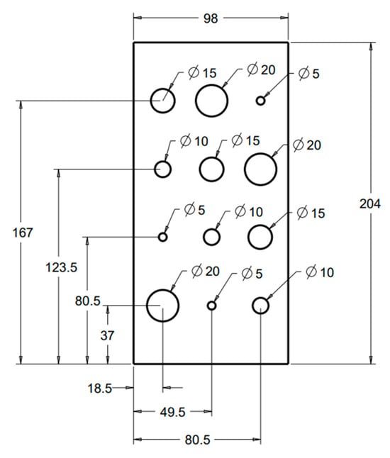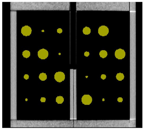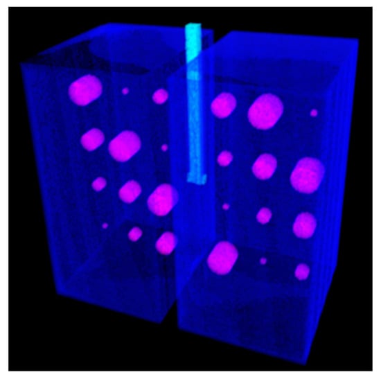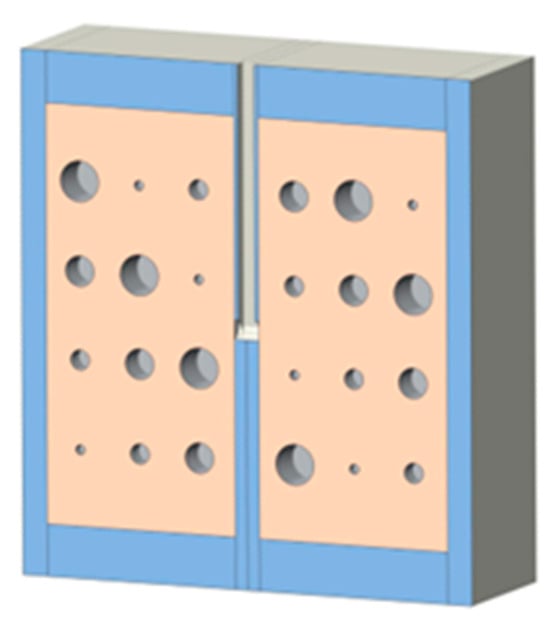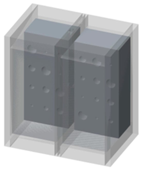 In our study, we used a polymer foam suggested by NIST [] to fill the lung volumes in our cystic lung phantom model. Two rectangular foam blocks, each with the dimensions of 204 mm × 98 mm × 125 mm, were used to model the right and left lung compartments. In the interior of each lung compartment (Figure 1), 12 cylindrical cavities were cut using a precision CNC system. Cavities are arranged in four rows and three columns. The cavities include varying sizes: three with a diameter and depth of 20 mm, three with a diameter and depth of 15 mm, three with a diameter and depth of 10 mm, and three with a diameter and depth of 5 mm. These cavities model cysts of varying sizes in the lungs. Figure 2 shows a 3D rendition of the cavities in the lung compartments. The number and arrangements of the cavities were dictated by several practical factors, including the feasibility of machining the cavities to good precision, the need to have the same size cavities distributed in various locations both near the edges and in the center of the lung volume, and lastly, to have sufficient spacing between the cavities to allow precise machining.