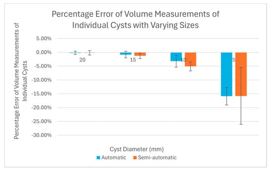 Bar graphs showing the percentage errors of volume measurements for cysts of different sizes. Results for both the automatic (blue) and semi-automatic (orange) software are plotted. The error bars are the standard deviation of the percentage error for each group of cysts of a specific size.