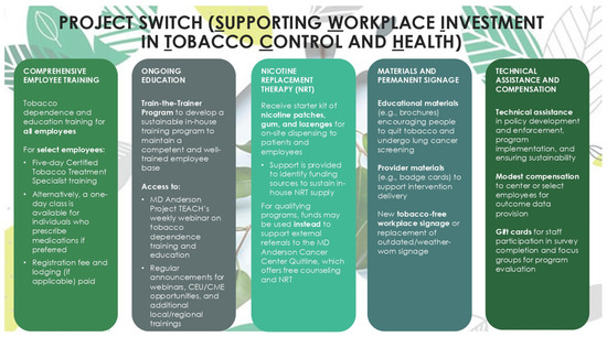 Various components of Project SWITCH, a tobacco-free workplace program for lung cancer screening centers in Texas, US (2023–2026).