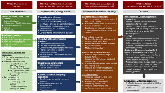 Tobacco-free workplace programs that include the adoption of a comprehensive tobacco-free workplace policy (no tobacco use/vaping anywhere on site), staff education/training about the harms of and how to treat tobacco use, and resource provision (e.g., where and how to receive care) are evidence-based interventions to build organizational capacity to address patients’ (and staffs’) tobacco use and to prevent relapse. Since 2013, the research team has been implementing and disseminating a tobacco-free workplace program to reduce tobacco use health risks among patients and staff in a variety of healthcare and community settings across Texas, US, including centers serving people experiencing homelessness [32] and clinics serving people who have behavioral health needs (substance use disorders and/or mental health diagnosis) [33,34,35]. According to social cognitive theory, programming components can drive behavioral changes in diverse settings by targeting environmental and personal factors and behavioral capability [36]. Through processes such as observational learning and reciprocal determinism, individuals adapt their behaviors to their social context. Following program implementation, changes in tobacco cessation capacity have included greater tobacco-related knowledge and training among staff [35,37,38], more consistent screening and intervention delivery by care providers [32,34,39], and provision of cessation medication and counseling to patients and staff [32,33,40]. Each of these respective components is evidence-based and adapted to each setting using implementation strategies suited to the context and an iterative mixed methods evaluation process.