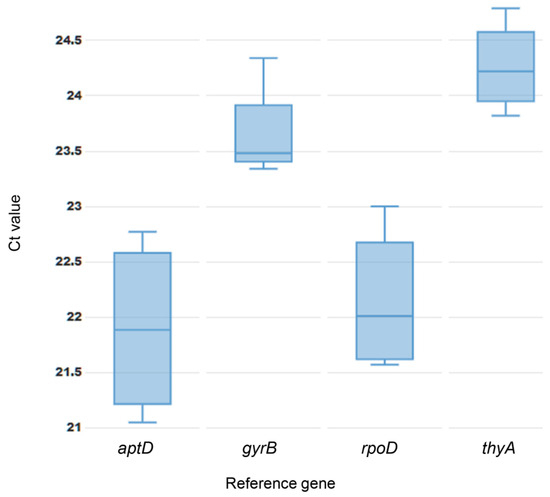 Meanwhile, the geNorm method assessed the stability of reference genes by calculating M values. Lower M values indicate higher stability; if M ≤ 0.5, it is typically considered stable [21]. The relative quantities of the four reference genes displayed varied expression profiles (Figure S2). The average M value of four reference genes was 0.422 and only M value in atpD was higher than 0.5 (Table 2). The ranking of the optimal reference genes based on their stability was: rpoD (0.35) > gyrB (0.37) > thyA (0.45) > atpD (0.52) as shown in Table 2. The ΔCt method was performed to obtain the average SD of pairwise ΔCt values in all the reference genes (Table 2; Figure S3). The most stably expressed reference genes were rpoD (SD: 0.34) and gyrB (SD: 0.37), whereas the least stably expressed genes, thyA and aptD, had SD of 0.45 and 0.51, respectively (Table 2).