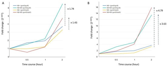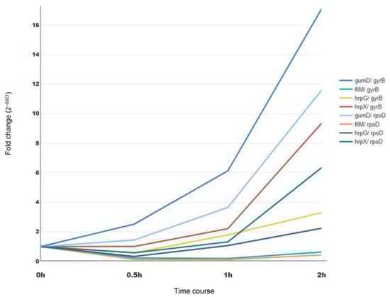 The expression profile of the gumD gene, which encoded the pentasaccharide repeating unit of xanthan [29], showed the highest upregulation in NB + MS samples during the 2 h incubation compared to that of other target genes (Figure 3). In the previous study, the X. campestris pv. campestris gumD knockout mutant displayed a reduced virulence during infection on broccoli leaves [30]. Similarly, the X. oryzae pv. oryzae gumD knockout mutant showed a significant reduction in lesion size, decreasing to about 11% on the susceptible rice cultivar IR24 [31]. Therefore, the elevated gene expression suggests that the gumD gene is likely one of the key genes influencing pathogenicity in the Xpd-Anthurium pathosystem. To determine whether the highest gene expression of gumD was induced by the addition of A. andreanum MS microplant powder, a comparison of gumD gene expression profiles, normalized using the two optimal reference genes—gyrB and rpoD—was performed on time course samples cultured with NB+ and NB + MS, respectively (Figure 4). Using the 0 h-NB+ sample as a baseline, the results demonstrated differential gene expression after 1 h, and the gumD gene, normalized by gyrB and rpoD, respectively, was upregulated about 1.74- and 1.43-fold in the 2 h-NB+MS sample compared to the 2 h-NB+ sample (Figure 4A). Notably, the gumD gene expression profiles differed depending on whether the 0 h-NB+ and 0 h-NB+MS samples were independently used as the baseline for each time course set (Figure 4B). The differences in fold changes were more than twofold when calculated using different baselines, indicating that the gene expression changes occurred immediately after the addition of MS microplant powder. The gyrB gene demonstrated greater stability than the rpoD gene due to its consistent gene expression profile (Figure 4). Despite the varied gene expression levels, the gumD gene, involved in the biosynthesis of xanthan gum, differentially regulated pathogenicity in the interactions between Xpd and the susceptible A. andreanum cultivar MS.