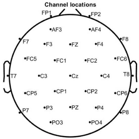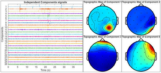 Figure 9. In this figure, the left panel displays the time courses of 26 independent components extracted from an EEG recording using ICA, while the right panel shows the topographic maps of four selected components (Components 1, 2, 3, and 6) that were identified as artifacts. Component 1 presents a highly focal topographic pattern, restricted to a single electrode location, along with erratic fluctuations in its time course, consistent with impedance artifacts. Component 2 displays high-frequency activity and a spatial distribution in the temporal region, characteristic of electromyographic (EMG) artifacts, usually related to jaw or facial muscular activity. Components 3 and 6 represent strong frontal activation patterns and slow drifts in the time course, which are indicative of ocular artifacts. While the former shows a symmetric frontal topography and a stereotyped, large-amplitude transient in the time course, characteristic of an eye blink, the latter, in contrast, presents a left–right bipolar topographic distribution and a more gradual temporal pattern, which is typical of horizontal eye movements. Because ICA decomposes the EEG signal into statistically independent temporal sources, the distinct time courses of eye blinks and horizontal eye movements allow them to be separated into different components, despite both originating from ocular activity [