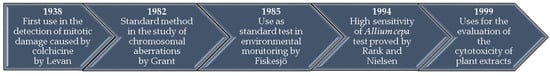 Since 1938, when it was used for the first time by Levan [] when studying the effect of colchicine on the mitosis of onions, the methodology of the Allium cepa assay has undergone continuous improvements, making it appropriate for many applications. Important contributions to the development of this bioassay were made by Grant [,], Fiskesjö [,], Rank and Nielsen [] (Figure 1). They reported that, when compared to other test materials, Allium material can produce similar results. It has also been demonstrated that this model has high sensitivity and can be used as a standard method for environmental monitoring [,,,].
