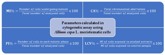 The most important cytogenetic parameters calculated based on microscopic observations are the mitotic index (MI) and the proportion of chromosomal abnormalities (CA). In some reported studies, in addition to these parameters, the index of each phase of mitosis (PI) is also calculated [,,,], as well as the limit value of cytotoxicity (LCV) [,,,]. The calculation formulas of these parameters are detailed in Figure 5.