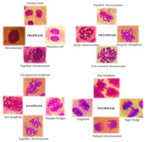 Chromosomal aberrations (CAs) are changes in the structure and number of chromosomes and can be observed in all stages of mitosis. The most remarkable cells can be highlighted; especially in anaphase and telophase, CAs appear in the form of chromosome bridges, chromosome losses and fragments, chromosome delays, disorganized and multipolar anaphases (star anaphase), and c-mitosis. A series of chromosomal aberrations can also be highlighted in the metaphase as a result of the expulsion of whole chromosomes from the metaphase plate, as well as chromosome breaks, chromosome fragments, and irregular metaphases []. Chromosomal aberrations are caused by the breakage of chromosome fragments, the unbalanced exchange of chromatid segments, or damage to the mitotic spindle.