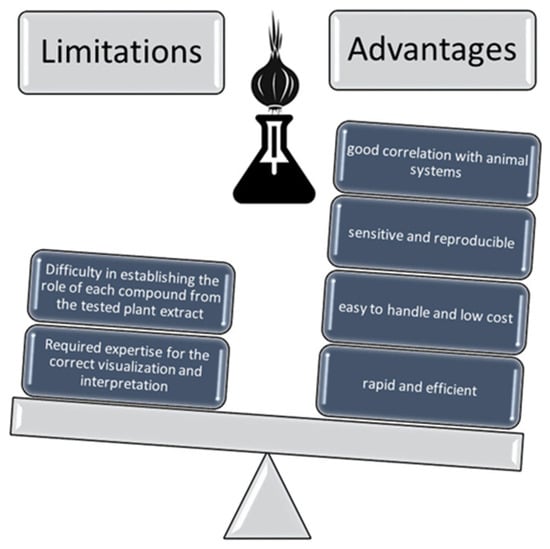 The Allium cepa model is not a perfect tool, presenting some limitations (Figure 8). Considering that plants extracts represent a complex mixture of biomolecules, it is difficult to establish the selective influence of each compound on cell division. Some of them may have cytotoxic and/or genotoxic effects, while others may possess cytoprotective and/or antigenotoxic properties. Moreover, the use of the test requires expertise in the correct visualization and interpretation of mitotic phases and chromosomal abnormalities. Based on the research reviewed, it most often emerged that, for a more in-depth study of the cytotoxicity of plant extracts, other tests must be performed, as a complement to the Allium test.