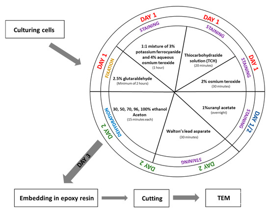 We introduced several changes to the original protocol, for example, we simplified the fixation process by using glutaraldehyde alone, omitting the mixture of glutaraldehyde, formaldehyde, and calcium chloride. We also substituted a cacodylate buffer with phosphate buffer throughout the entire procedure to minimize toxicity. These changes did not affect fixation quality, as confirmed by TEM imaging. The staining steps, like mixtures and time slots, are unchanged. Another optimization involved the dehydration process. We adjust the alcohol concentration and incubation durations based on our previous experience in electron microscopy sample preparation [15,16,17]. Our protocol closely resembles the one published by Śliwińska et al. 2021 [4] for brain tissue fixation. The differences are minimal, suggesting that this protocol may be broadly applicable to both tissue samples and cultured cells.