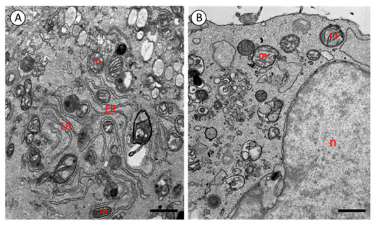 Electrograms of fibroblast (A) and iPS cell (B). m—mitochondria; ER—endoplasmic reticulum; n—nucleus. TEM. A: scale bar = 1.10 μm, B: scale bar = 1.09 μm.