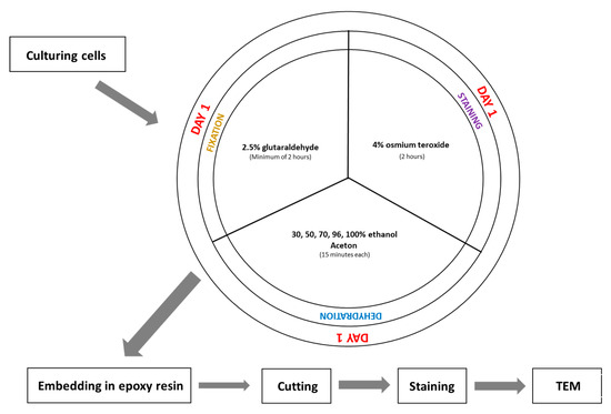 A protocol for preparing biological specimens for SBEM was described by Deerinck et al. in 2010 [14]. This protocol remains widely used today, often with minor modifications tailored to specific tissues or experimental goals. These adjustments typically involve variations in buffer composition or the series of alcohols used for dehydration. Numerous adaptations of this protocol have been reported, for instance, for mouse hippocampal tissue [4] or cultured Vero cells [5,6]. Despite these advances, there is still a need to optimize fixation protocols for different cell types and experimental contexts, especially for in vitro applications.