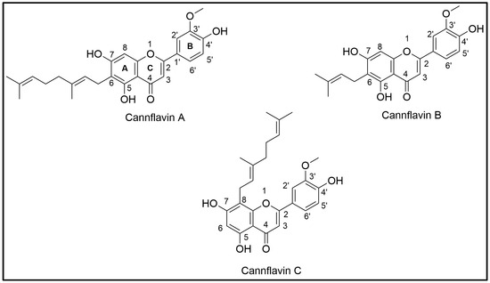 Flavonoids, including cannflavins, consist of C6–C3–C6 fundamental building rings, namely, rings A and B connected by a three-carbon ring, C (Figure 1) [31]. Cannflavins are biosynthesized from luteolin, which undergoes enzymatic methylation and prenylation [32,33].