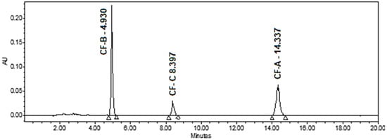 - Mobile Phase Composition: The polarity and strength of the mobile phase directly affect analyte interaction with the stationary phase. A higher organic content speeds up elution, reducing retention time but may lower resolution, especially for CF-B and CF-C. Conversely, a lower organic content enhances separation but extends the run time. We chose a mobile phase of acetonitrile and water (65:35, v/v), both containing 0.1% formic acid, at a flow rate of 1 mL/min, with the detector set at 342.4 nm to balance these effects and ensure baseline resolution of CF-B, CF-C, and CF-A.