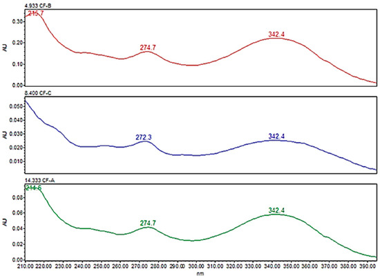 During the initial development of the method, the use of a PDA detector was beneficial for identifying lambda maxima (λmax) of cannflavins. The UV spectra of all the cannflavins exhibited three absorption maxima (λmax), at 220 nm, 274 nm, and 342.4 nm. The λmax, 342.4 nm, was selected as the wavelength for the quantification of cannflavins (Figure 3).