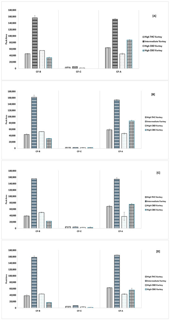 Extraction results of the target cannflavins using different solvents: (A) methanol extract, (B) ethanol extract, (C) acetone extract, and (D) ethyl acetate extract for the different chemovars.