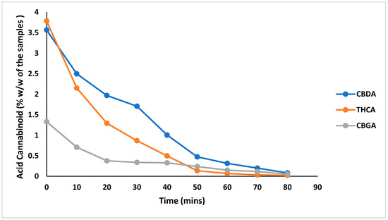 In the decarboxylation study, cannabis samples of the three chemovars (high CBD, high THC, and high CBG) were heated at different temperatures, and the cannabinoids were analyzed before and after decarboxylation. Complete decarboxylation of THCA was achieved at 70 min, while CBDA and CBGA were fully decarboxylated at 80 min. All decarboxylation temperatures were carried out at 130 °C (Figure 5).