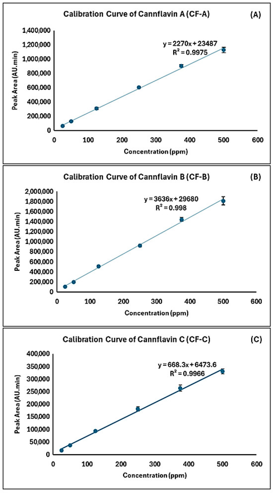 External calibration curves were constructed by plotting the peak area of each cannflavin versus the concentration in triplicate. All the analyzed cannflavins standards were linear over the dynamic concentration range of 5–500 ppm with correlation coefficients (R2) of ≥0.997 (Table 1). The calibration curves are displayed in Figure 6.