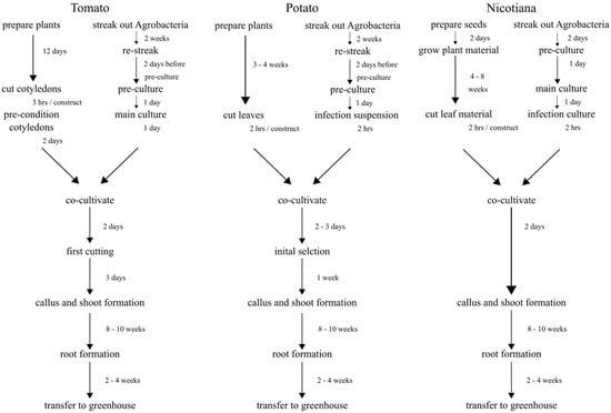 In this compendium, we bring together three protocols for the transformation of various Solanaceae genera and species that we have used over the last 25 years. This work is in various master’s and doctoral theses, and a cornerstone of various publications as acknowledgements or authorship [26,27,28]. The goal has been, and is, the continual optimization and simplification of the steps needed for smooth and reliable tissue culture transformation as part of our Institute’s research objectives. These protocols are rooted in works that showed that many genera and species from Solanaceae could be transformed [5,29,30,31,32], and observations we have made over the years that work best with our equipment and research paradigm. Most importantly, we wish to provide the readers with a good base to start their own tissue culture program and provide a rich resource for those who already have one.