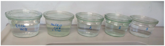 - Swirling for 10 min by hand in 200 mL 1.25% sodium-hypochlorite containing a few drops of 0.001% Triton X-100 (in sterile water).