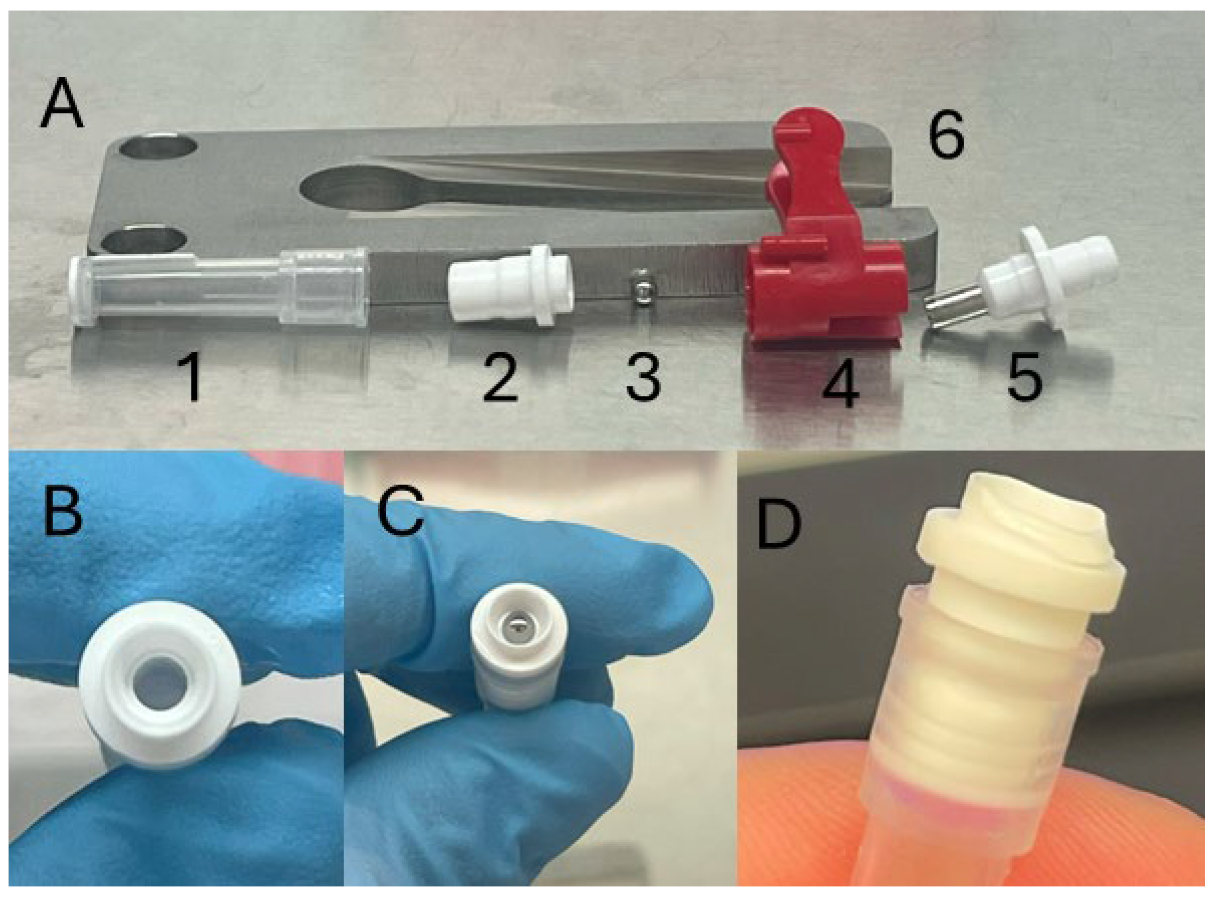 - Insert a single ball bearing into the opening of the TSU connector and ensure it is firmly secured using the blade holder (Figure 2A(4)). Repeat for all connectors prior to subsequent steps.