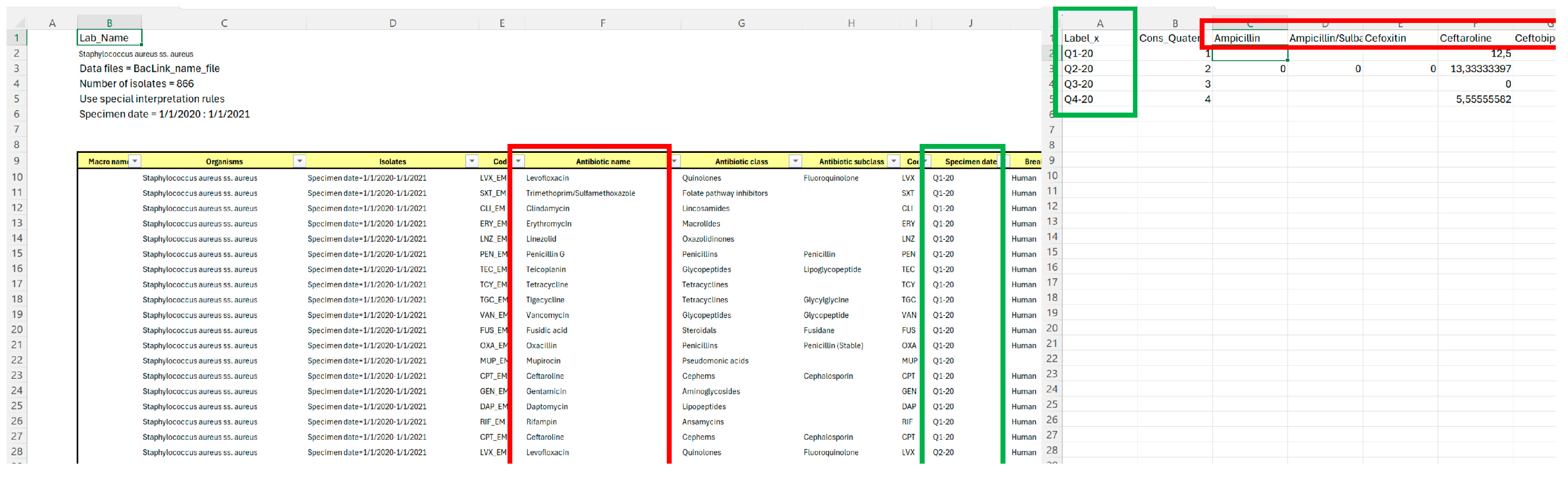 $F$9:$F$90 | The range refers to the column containing data on the tested antibiotics in the ‘01.%RIS’ sheet. These values are matched with the headers in the data_to_R sheet using the formula described in Appendix A, which extracts and translates the corresponding data for each antibiotic and quarter. |