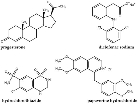 The structure of the model compounds is shown in Figure 1, and their most important physico-chemical properties are presented in Table 1. Diclofenac sodium (DICL-NA), hydrochlorothiazide (HCT), papaverine hydrochloride (PAP-HCL) and progesterone (PROG) were purchased from Sigma-Aldrich Co. LLC. (St. Louis, MO, USA). The buffer components (acetic acid (99–100%), phosphoric acid (>85%), boric acid and sodium hydroxide) were provided by Molar Chemicals Ltd. (Halásztelek, Hungary). For the preparation of the buffers, pharmacopoeial grade distilled water was utilized.