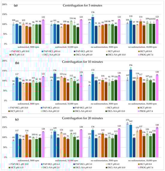 The speeds of rotation compared were 5000 rpm and 10,000 rpm. Higher centrifugation speed led to increased solubility values in most cases. The most notable case was PAP-HCL at pH 10.0, where after 20 min of centrifugation, the solubility nearly doubled compared to the other samples. Comparing datasets where only the centrifugation speed differed, samples centrifuged at 5000 rpm yielded results closer to the reference value, as seen in Figure 3. This trend is most evident with compounds where a sedimentation step was applied before centrifugation for 5 min. The highest difference between samples centrifuged at 5000 and 10,000 rpm can be observed among the non-sedimented samples, centrifuged for 20 min.