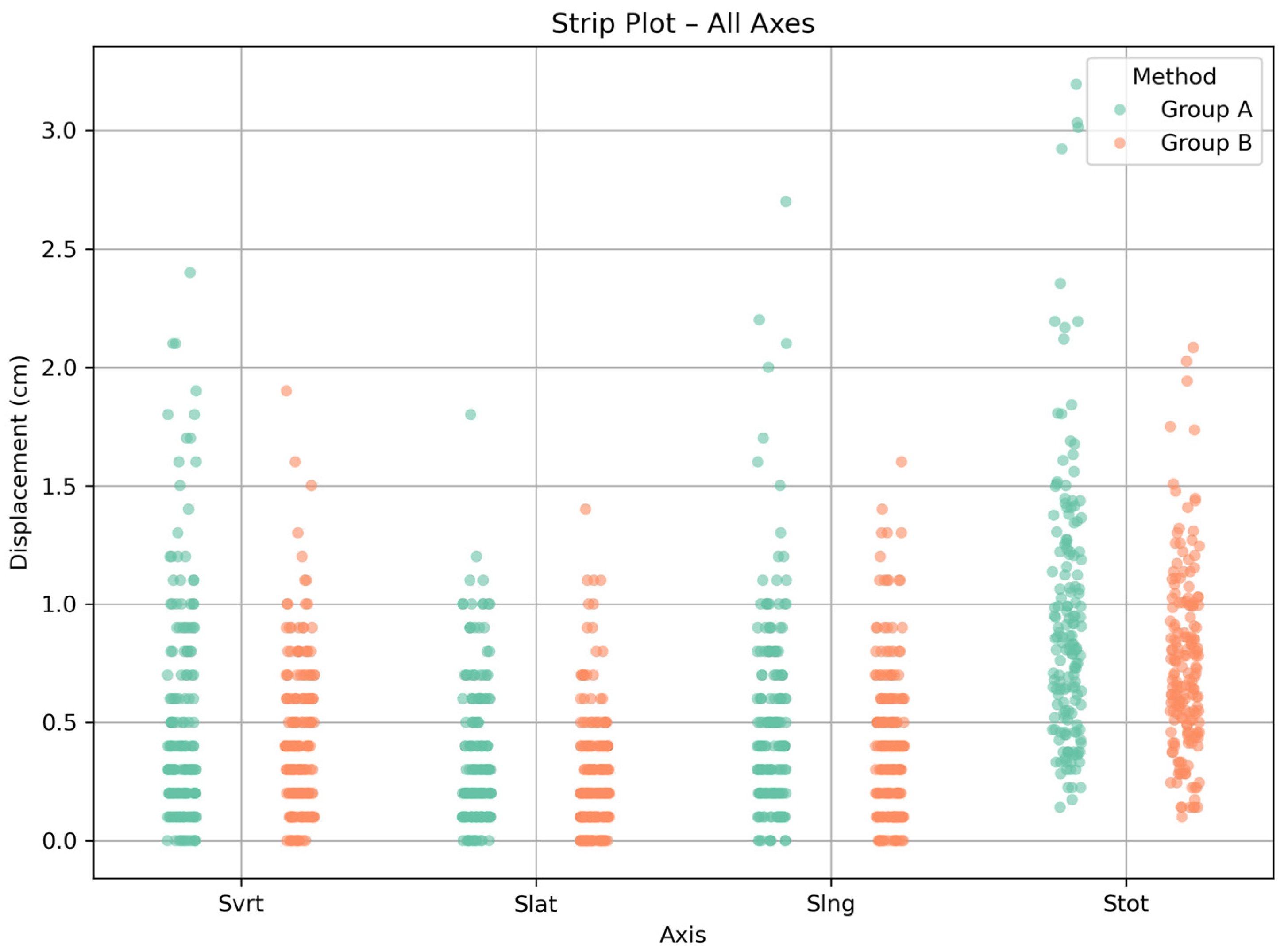 Setup Technique | Displacement | IQR (Q1, Q3) (cm) | Q1 (cm) | Q3 (cm) |