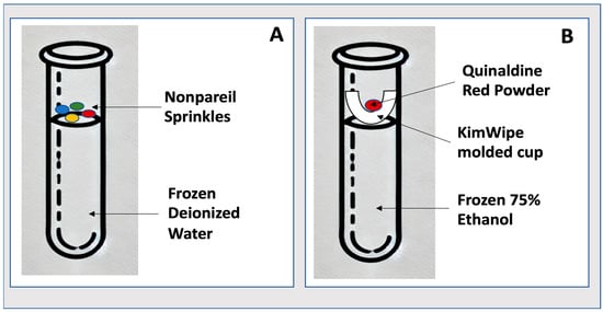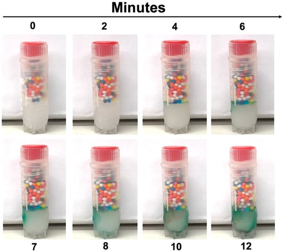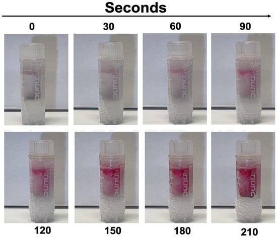 Proof-of-principle tests were performed to ensure indicator vials were capable of detecting partial thaw events. As such, frozen indicators (Figure 4), stored at −20 °C, were removed from the freezer and exposed to ambient room temperature (~22 °C) for defined intervals of 5 min and 8 min. After each exposure period, the vials were returned to −20 °C storage. Following refreezing, the vials were examined to evaluate sprinkle dye dispersion as a measure of thaw detection.
