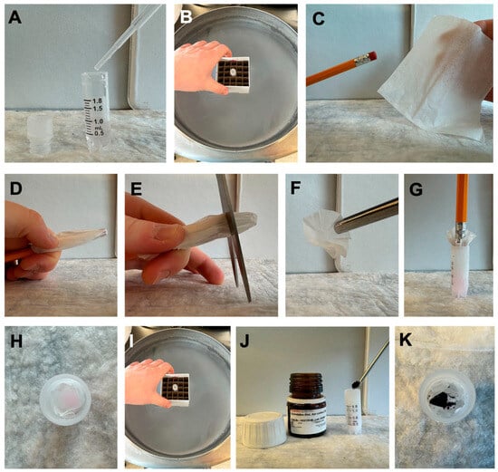 Frozen indicator methods in the ultra-low-temperature environment (−80 °C). Frozen indicators were generated by freezing a 75% ethanol solution (A,B), generating a ‘cup’ (C–H), chilling (I), and then adding indicator dye (J,K).