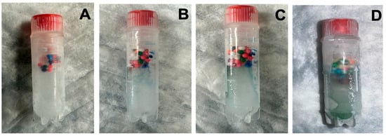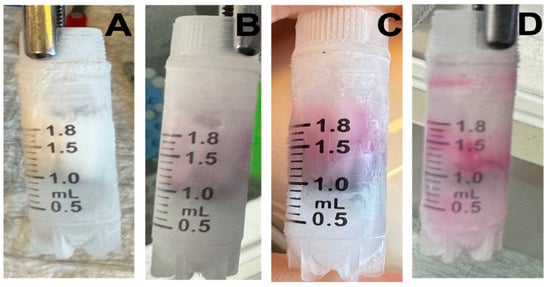 Frozen vial validation (−20 °C). Indicators were frozen and maintained for more than 1 h at −20 °C (A), then thawed at room temperature for 5 and 8 min, respectively (B,C), and then refrozen at −20 °C (D).