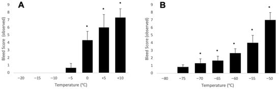 Partial thaw detection mapped. Vials were sustained for 15 min at various temperatures ranging from fully frozen (−20 or −80 °C) to temperatures that would induce a partial thaw event for frozen vials (A) and ultra-low-temperature vials (B). Using a visual bleed score (Supplementary Materials), a gradual increase in dye detection was seen as temperatures rose, with significant detection (*) at 0 °C and higher in the frozen indicators and −70 °C and higher in the ultra-low-temperature indicators.