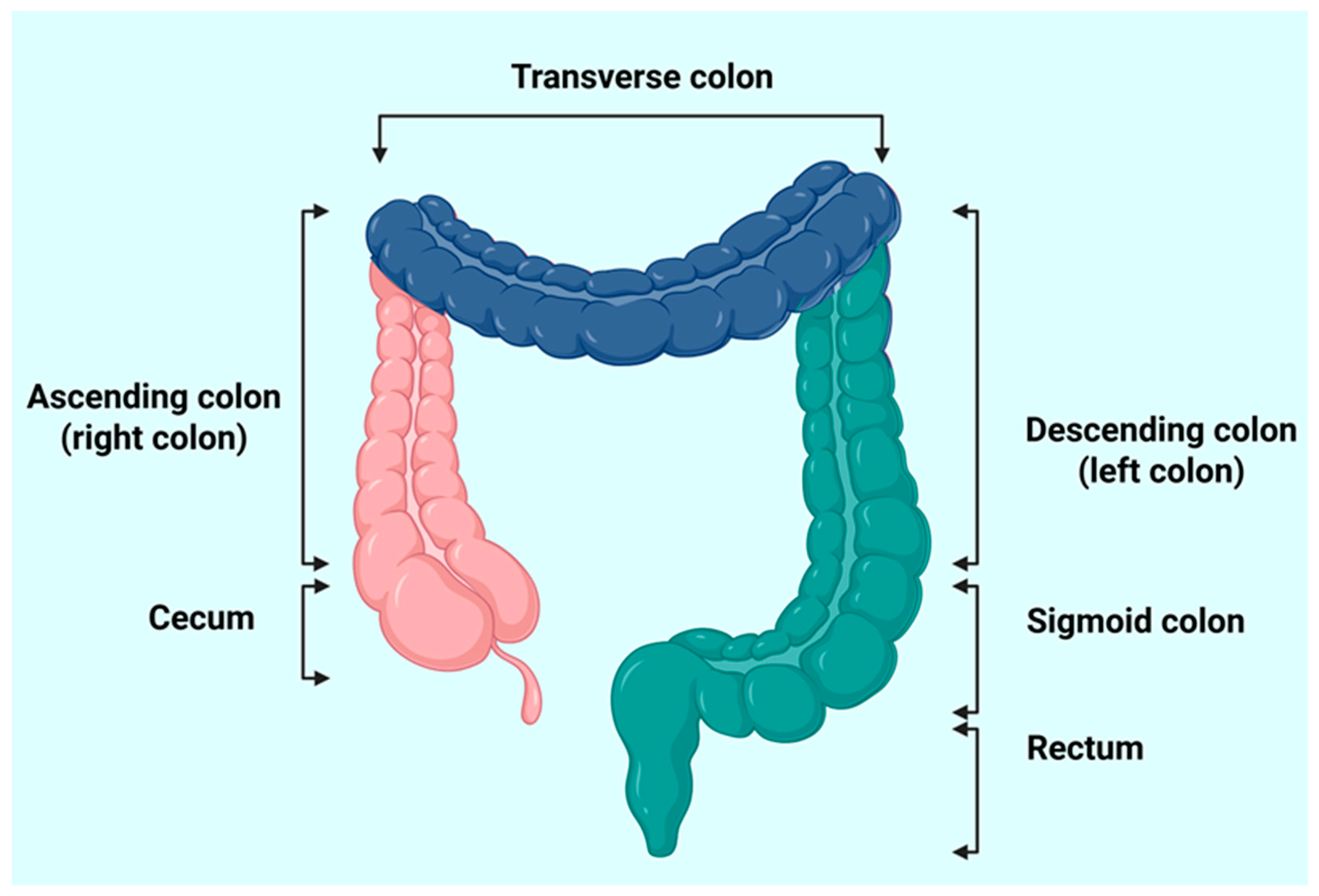 - Yang, Q.; Qu, R.; Lu, S.; Zhang, Y.; Zhang, Z.; Fu, W. Biological and Clinical Characteristics of Proximal Colon Cancer: Far from Its Anatomical Subsite. Int. J. Med. Sci. 2024, 21, 1824–1839. [Google Scholar] [CrossRef] [PubMed]