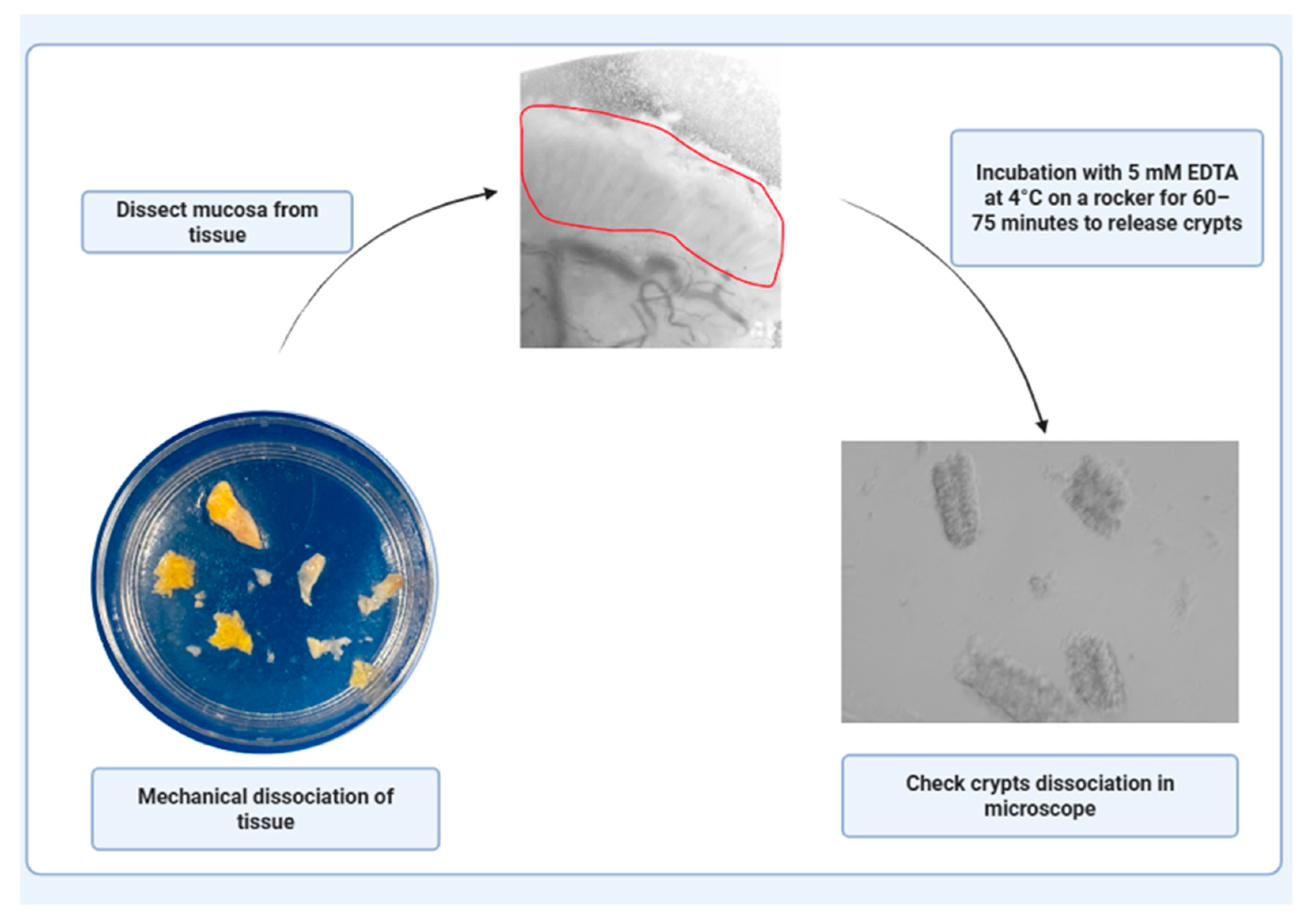 - Mechanical disruption by pipetting tissue up and down with the coated pipette to release crypts. Check the dissociated crypts under a microscope to confirm successful crypt isolation (Figure 2).