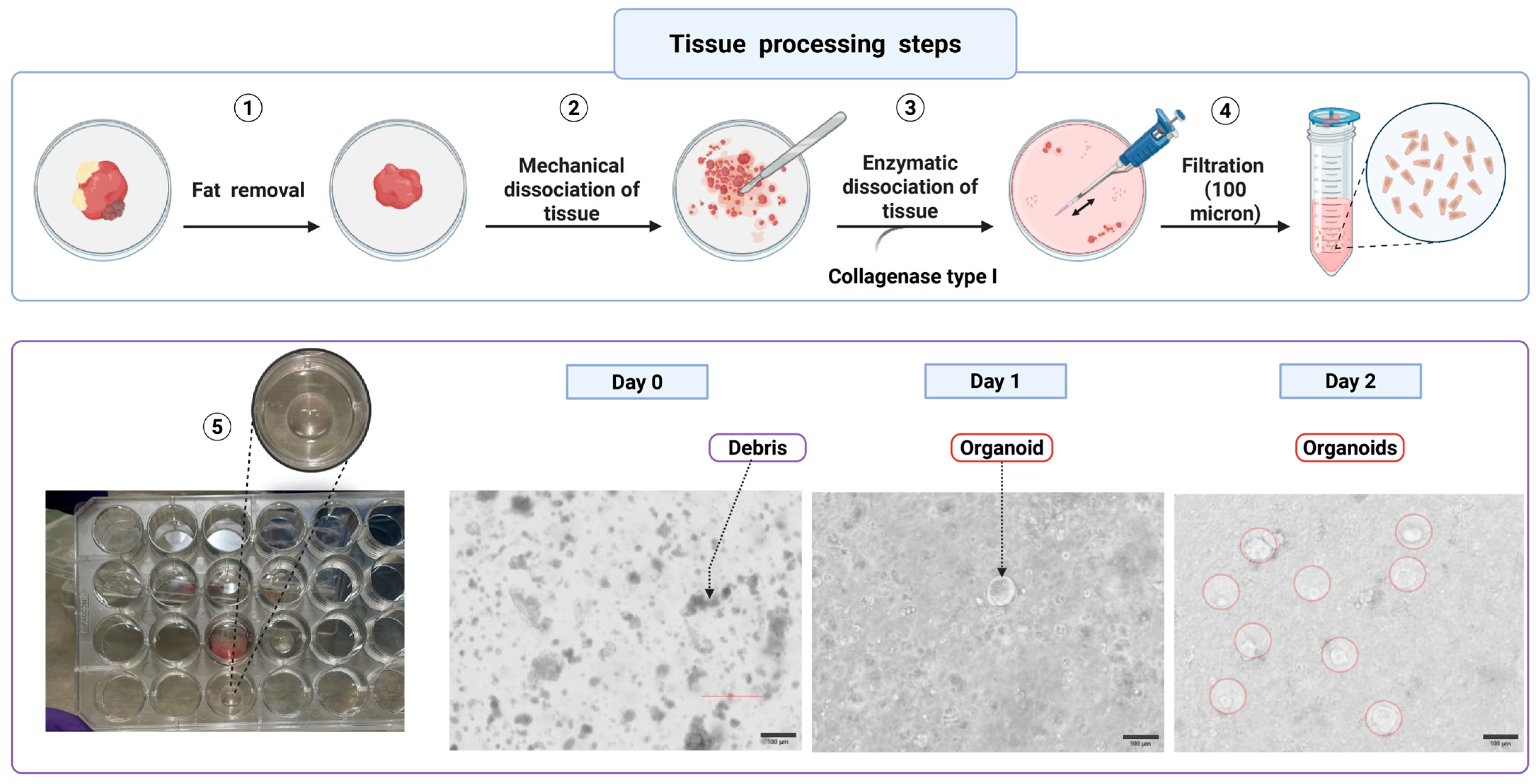 CRITICAL STEP: Transfer samples in a 15 mL Falcon tube containing 5–10 mL of cold Advanced DMEM/F12 medium supplemented with antibiotics (e.g., penicillin-streptomycin) to avoid microbial contamination during transit. Delays in tissue processing reduce cell viability and impact organoid formation efficiency. Cryopreservation is an additional option to preserve the tissues for future organoid development.