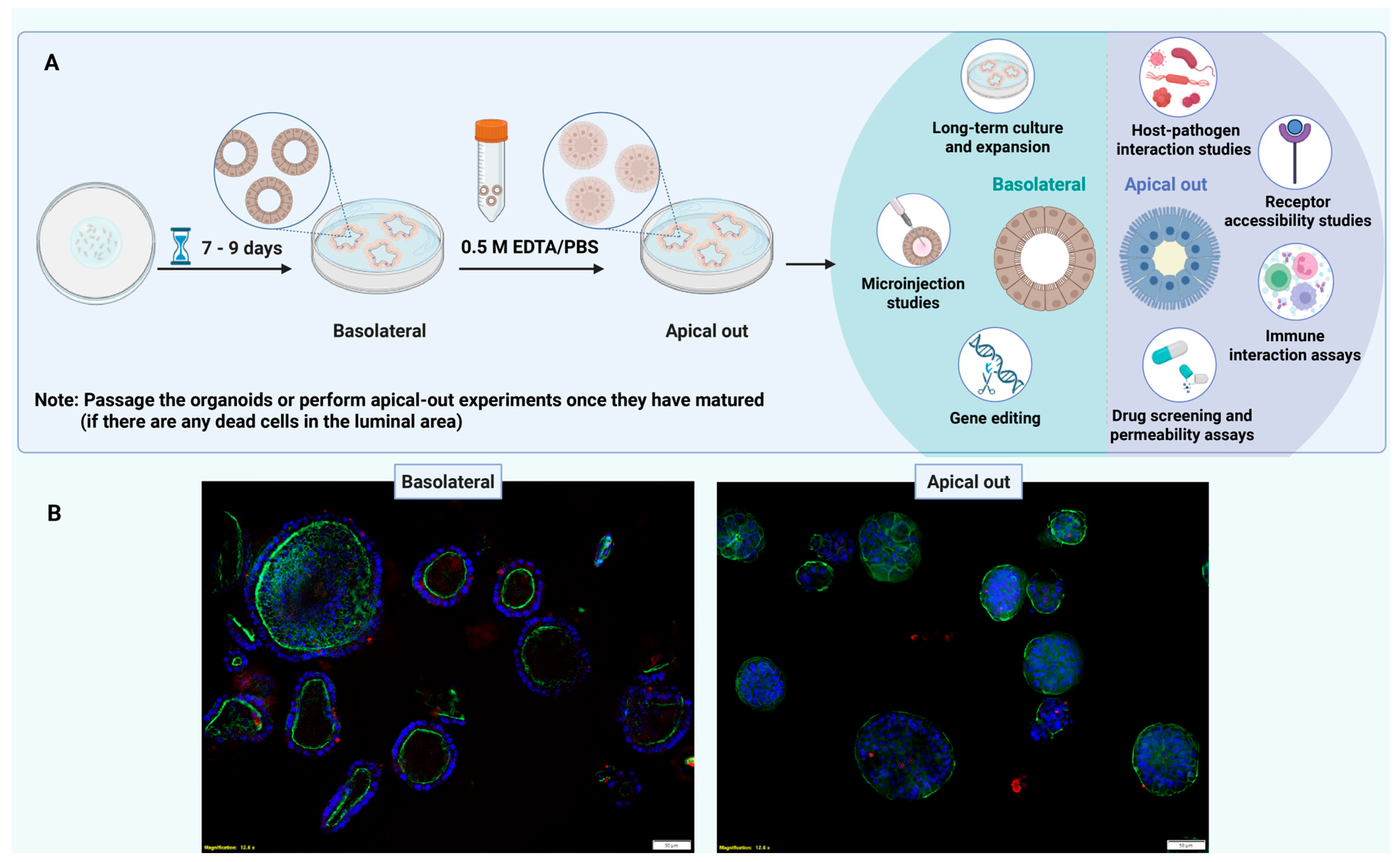 - Co, J.Y.; Margalef-Català, M.; Monack, D.M.; Amieva, M.R. Controlling the polarity of human gastrointestinal organoids to investigate epithelial biology and infectious diseases. Nat. Protoc. 2021, 16, 5171–5192. [Google Scholar] [CrossRef]