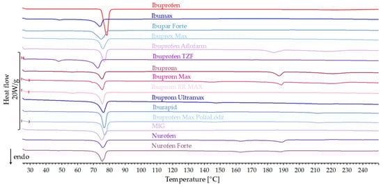 The ibuprofen standard DSC curve shows a sharp melting peak beginning at 74.7 °C. On the DSC curves of all pharmaceutical products containing ibuprofen as the only active substance, the onset of ibuprofen melting was observed in the range of 68.1–74.7 °C. Only in the case of Ibuprofen Max PolfaŁódź is this peak consistent with the melting point of the reference ibuprofen. For the other products, the phase transition began at lower temperatures than for the standard ibuprofen.