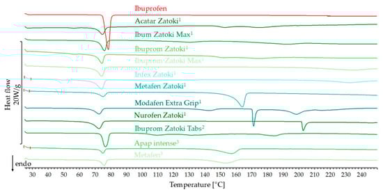 The DSC curves of pharmaceutical products containing ibuprofen and additionally pseudoephedrine hydrochloride, phenylephrine hydrochloride, or paracetamol are shown in Figure 2. To interpret these curves, ibuprofen standard and paracetamol standard DSC curves are also presented in this figure. The other ingredients are in the products in small amounts. According to literature data, the melting point of pseudoephedrine hydrochloride is observed in the range of 182–185 °C, while for phenylephrine hydrochloride it is approximately 145 °C [30,31]. The predicted and measured heat of melting values for ibuprofen in products are summarized in Table 1. The DSC curves of all products in this group show a melting peak of ibuprofen with onset at a lower temperature than the reference ibuprofen. The onset temperature for these peaks was in the range of 68.4–73.5 °C. The heat of melting measured for most products is 70.4–98.9% of the predicted heat of melting. The exception in this group is Nurofen Zatoki, for which this value is only 36.8% of the expected value.