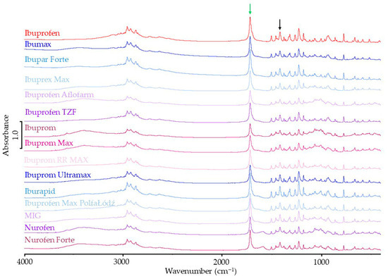 To interpret the spectra correctly, their band intensities were standardized. For this purpose, a strong band at 1420 cm−1 in the FTIR spectrum of ibuprofen was selected [29,32]. This band is indicated by a black arrow in Figure 3. The intensity of this band does not depend on the polymorphic form of ibuprofen. Regarding this band, the intensity of the other bands has been standardized. Spectrum standardization removes the influence of the active ingredient content in a pharmaceutical product on the result of the analysis of API crystallinity in the product. In the FTIR spectrum, the band at 1721 cm−1 is characteristic of the crystalline form of ibuprofen [32]. This band is marked with a green arrow.