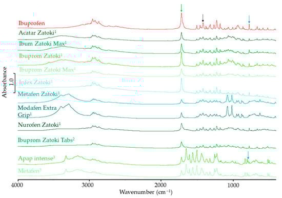 FTIR spectra of ibuprofen standard and pharmaceutical products with ibuprofen.
