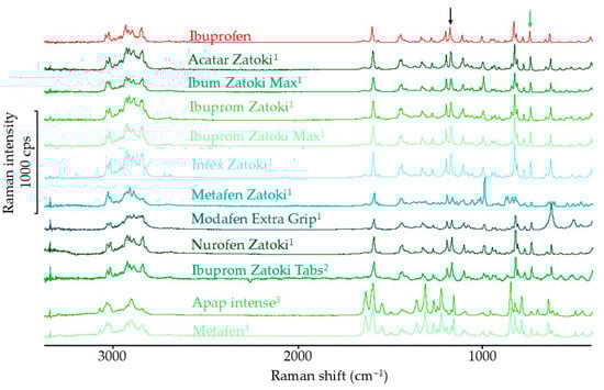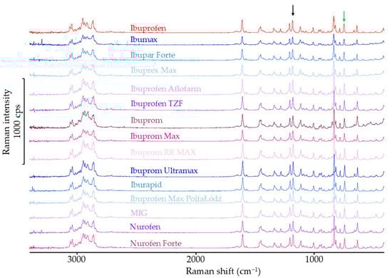 The Raman spectra of ibuprofen and products containing ibuprofen as the single API are shown in Figure 5. The intensity of the band at a shift of 1113 cm−1 is independent of the ibuprofen polymorphic form [36]. Therefore, the intensity of the other bands in the Raman spectra of ibuprofen and products containing this substance was standardized. The crystalline form of ibuprofen is confirmed by a band at a shift of 783 cm−1, so the normalized intensity of this band was used for subsequent calculations. The reference band in Figure 5 is marked with a black arrow, and the analyzed band is marked with a green arrow. The standardized intensity of this band in pharmaceutical products containing only ibuprofen was 63.7–95.5% of the value obtained for the ibuprofen standard.