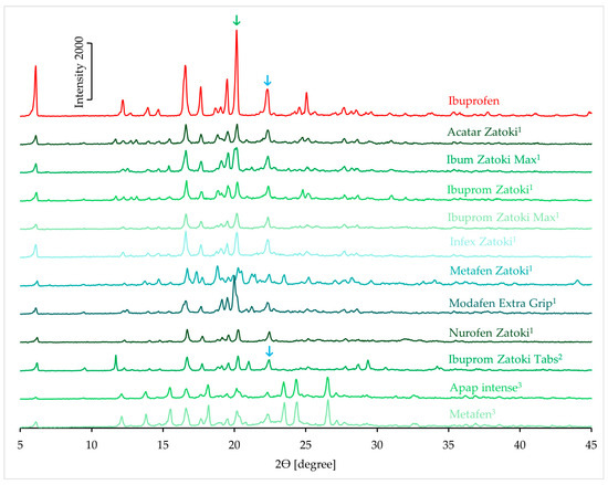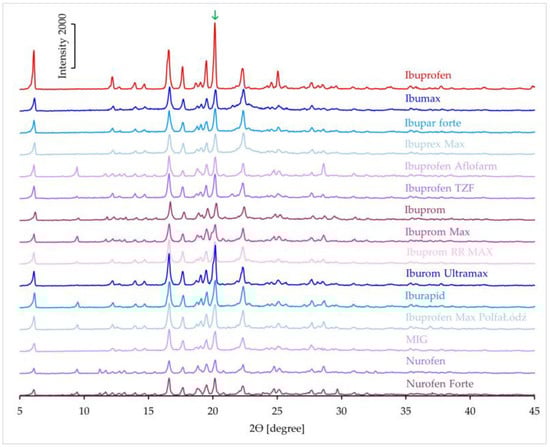 The XRD patterns of products containing ibuprofen and the second active ingredient are shown in Figure 8. The appearance of characteristic peaks in the spectra confirms that the products contain crystalline ibuprofen. In the XRD pattern of pseudoephedrine hydrochloride, there is no peak at approximately 20° 2θ, therefore, the crystallinity analysis of products containing this active substance was performed on the peak at 20.2° [39]. This peak is indicated with a green arrow in Figure 8. The calculated values for these products are summarized in Table 3. The intensity of the analyzed peak in these products ranges from 27.9% to 75.3% of the predicted value.