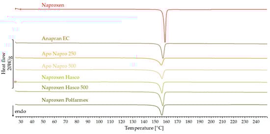 DSC curves of naproxen standard and pharmaceutical products with naproxen.