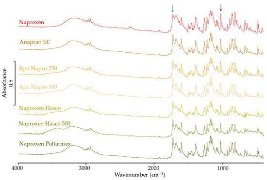 Figure 10 shows the FTIR spectrum of the naproxen standard and products containing this substance. According to the literature data, the intensity of the 1020 cm−1 band in the FTIR spectrum of naproxen does not depend on the polymorphic form [42]. This band is marked with a black arrow in Figure 10. The standardization of the intensity of the bands in the spectrum of naproxen and products containing this active substance was therefore carried out using this band. The existence of the crystalline form of naproxen is confirmed by the band at 1728 cm−1. This band is marked with a green arrow. The standardized band intensity values and the percentage of the expected band intensity calculated based on the naproxen reference spectrum are presented in Table 4. These results ranged from 72.9% to 94.3% of the predicted value.
