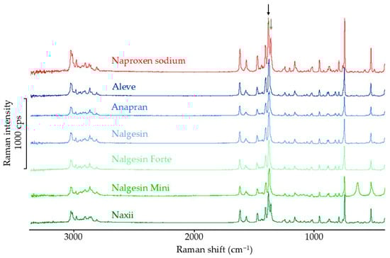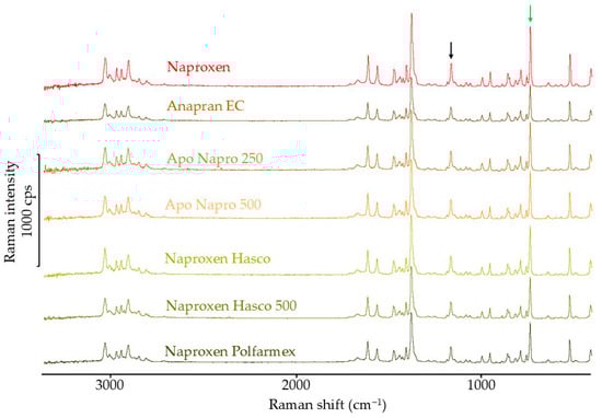 The Raman spectra of the naproxen standard and products containing this substance are shown in Figure 11. In the Raman spectrum of naproxen, the band at 1170 cm−1 is independent of the crystal form, and this band was used as a reference for standardizing band intensity [43]. Confirmation of the crystal form is possible based on the band at 760 cm−1. Therefore, the intensity of this band was used for subsequent calculations. The characteristic bands are marked with black and green arrows in Figure 11. The standardized band intensity of 760 cm−1 in naproxen products represents 93.1–98.2% of the value expected based on the naproxen reference spectrum. Table 4 summarizes the values calculated based on the Raman spectra of naproxen and naproxen products.