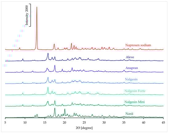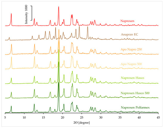 XRD patterns of naproxen standard and pharmaceutical products with naproxen.