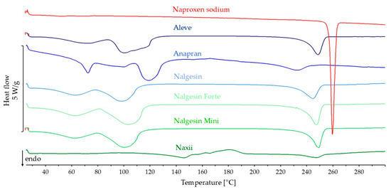 DSC curves of naproxen sodium standard and pharmaceutical products with naproxen sodium.