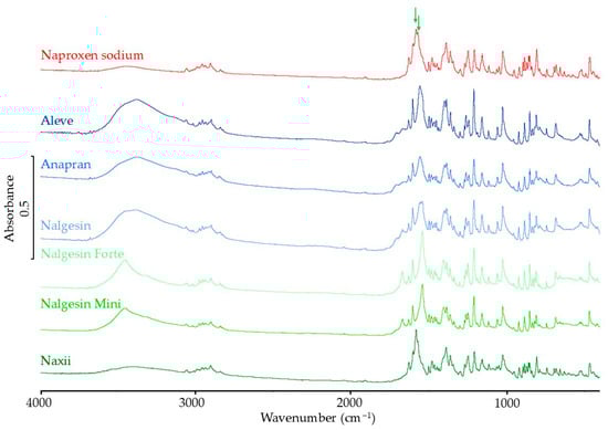 FTIR spectra of the naproxen sodium standard and products containing this substance are shown in Figure 14. According to the literature, the crystalline form is confirmed by bands at 1574–1583 cm−1 [42,43]. These characteristic bands are indicated by arrows in Figure 14. In the spectrum of the naproxen sodium standard, these bands are clearly marked, but in the spectra of the products in this range, several bands are visible, usually shifted in relation to the standard spectrum. Due to differences in the shape and position of the absorption bands of naproxen sodium in the products compared to the reference API, it was not possible to analyze the band heights indicating the presence of the crystalline form of naproxen sodium. Considering the complicated composition of the tablet matrix and the possible influence of excipients on the polymorphism of naproxen sodium in products, it is difficult to determine whether this influence is related to the overlapping of signals from excipients or the amorphization of naproxen sodium.