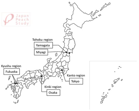 The Japan Pregnancy, Eating, Activity, Cohort (J-PEACH) Study is a multicenter prospective cohort study that surveys women throughout pregnancy and childbirth, and up to one year postpartum in Japan. Midwifery researchers from four national universities (The University of Tokyo, Yamagata University, Osaka University, and Kyushu University) are conducting the cohort study using a unified protocol at each site and are collaborating on data linkage. The study covers four regions: the Tokyo metropolitan area (Kanto region: the southeastern part of Japan’s main island, Honshu), Yamagata and Miyagi Prefectures (Tohoku region: northeastern Honshu), Osaka metropolitan area (Kinki region: west central Honshu), and Fukuoka Prefecture (Kyushu region: the southernmost of the four major islands) (Figure 1). Data are being collected at six hospitals: the University of Tokyo Hospital in the Tokyo metropolitan area, two hospitals in the Tohoku region (Yamagata University Hospital in Yamagata Prefecture and a community-based acute care hospital in Miyagi Prefecture), a maternal clinic in Osaka in the Kinki region, and two hospitals in the Kyushu region (Kyushu University Hospital and a primary care hospital in Fukuoka). The first cohort study was initiated at the University of Tokyo Hospital in February 2020, and the research team has recruited participants via a protocol that was modified because of the COVID-19 pandemic. All paper-based surveys were changed to online surveys to minimize face-to-face interactions. Other sites have been added since 2021, and the survey process is ongoing.